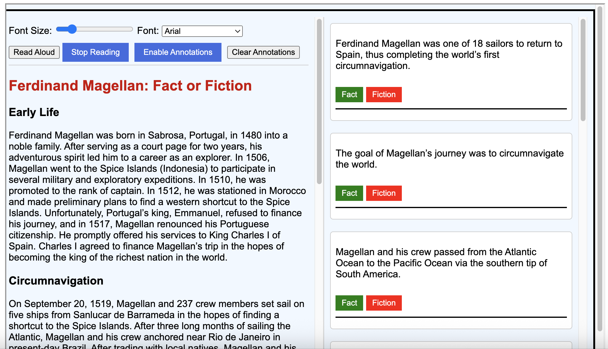 This fun activity requires students to read a Ferdinand Magellan passage and then, to sort 10 statements into those that are facts and those that are fiction. It gives immediate feedback.