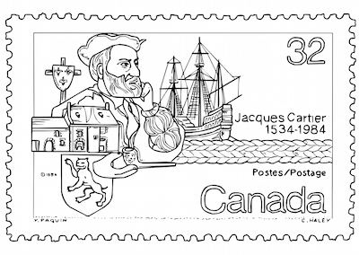 This is a coloring page that features a Canadian postage stamp that honors Jacques Cartier.