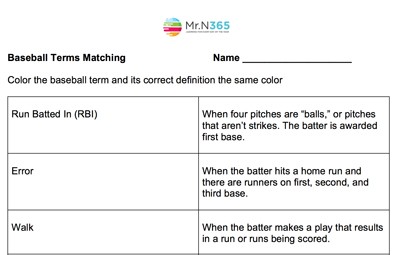 This matching activity will help kids get acquainted with baseball terms such as walk, double play, error, RBIs, strikeouts, doubles, triples, and more.